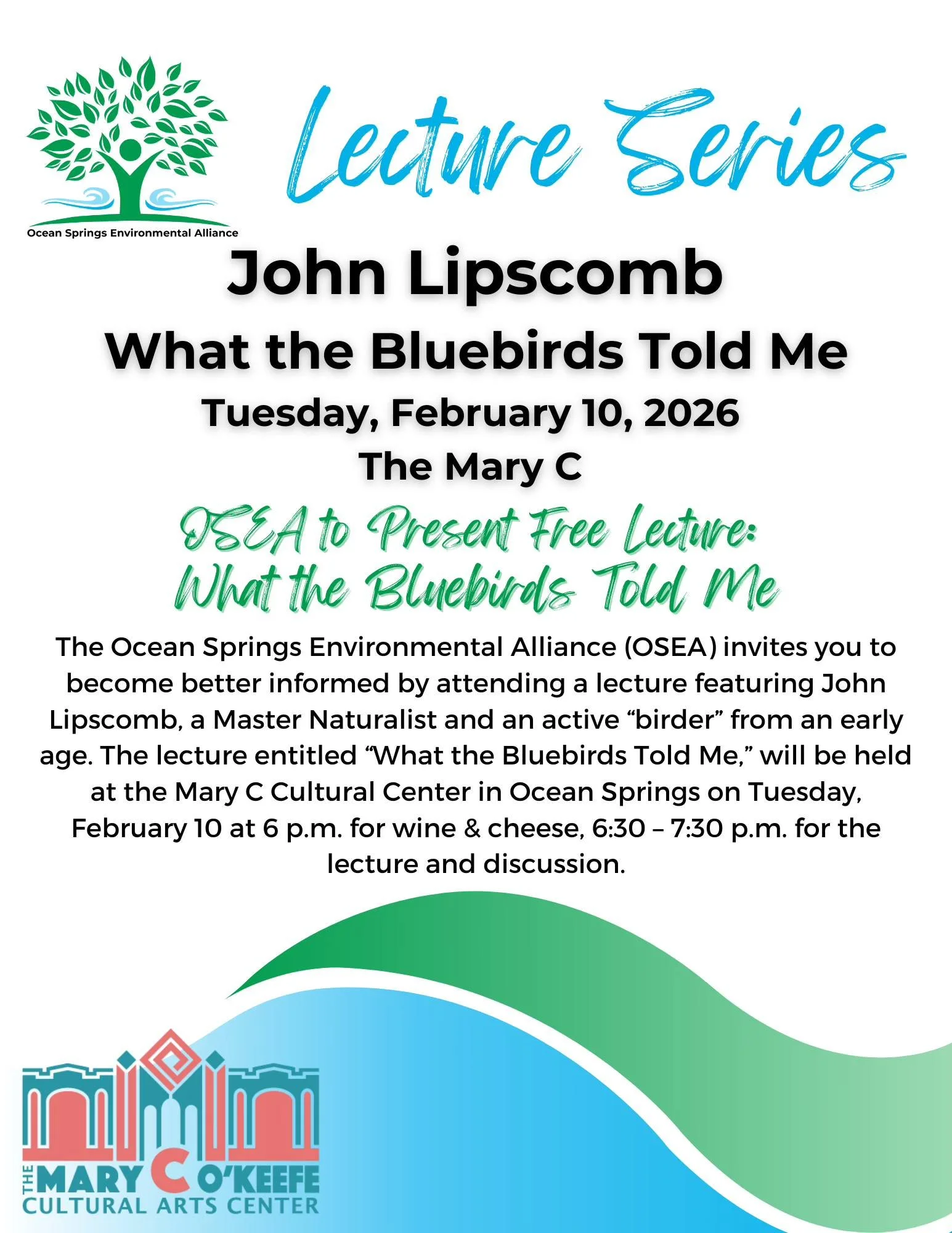 The Ocean Springs Environmental Alliance (OSEA) invites you to become better informed by attending a lecture featuring John Lipscomb, a Master Naturalist and an active “birder” from an early age. The lecture entitled, “What the Bluebirds Told Me,” will be held at the Mary C Cultural Center in Ocean Springs on Tuesday, February 10 at 6 p.m. for wine & cheese, 6:30 – 7:30 p.m. for the lecture and discussion.