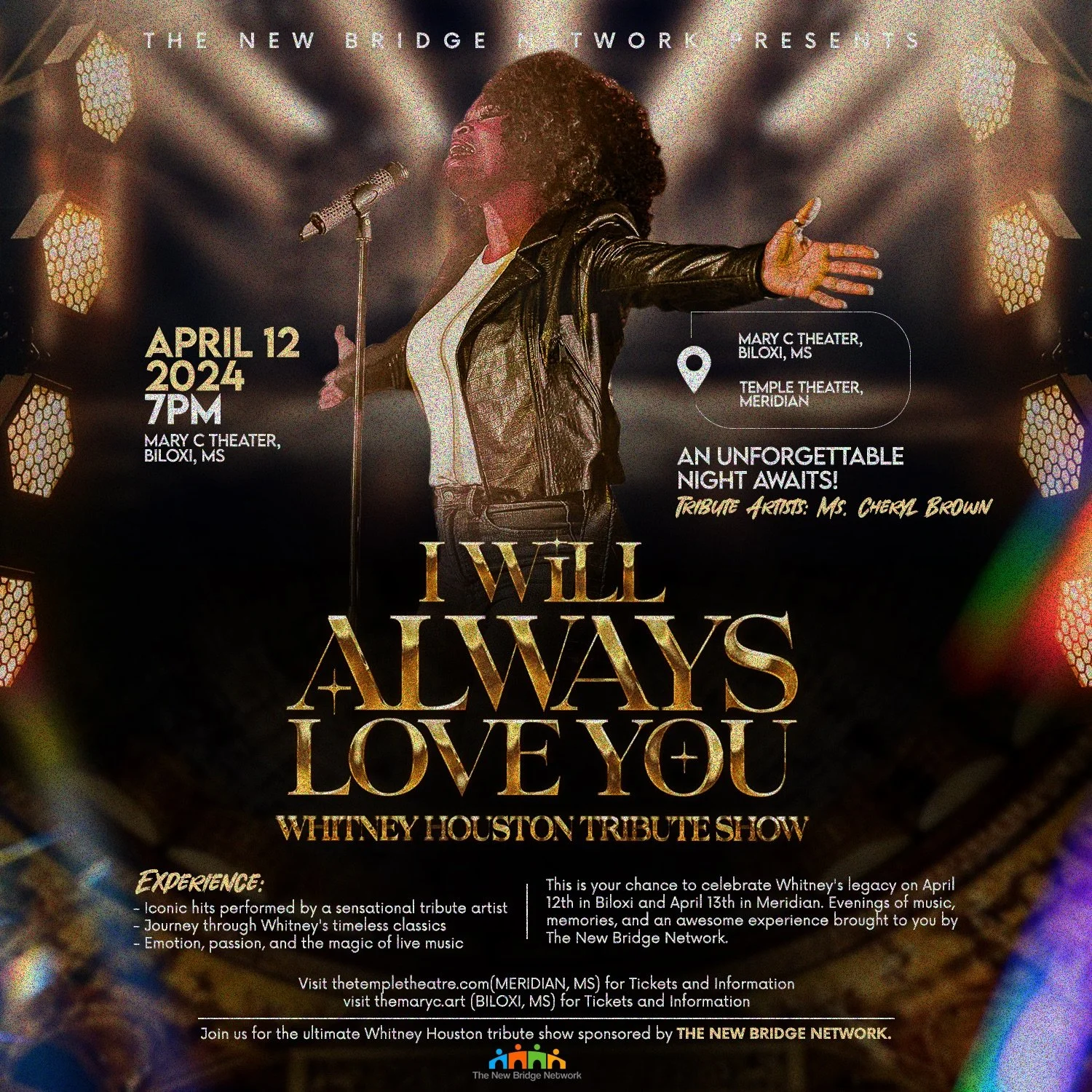 I Will Always Love You · Whitney Houston Tribute Show Friday, April 12, 2024 7:00 PM 9:00 PM The Mary C. O'Keefe Cultural Arts Center 1600 Government Street Ocean Springs, MS, 39564 United States (map) Google Calendar ICS This is your chance to celebrate Whitney’s legacy on April 12th in Ocean Springs. Evenings of music, memories, and an awesome experience brought to you by The New Bridge Network. PURCHASE TICKETS HERE