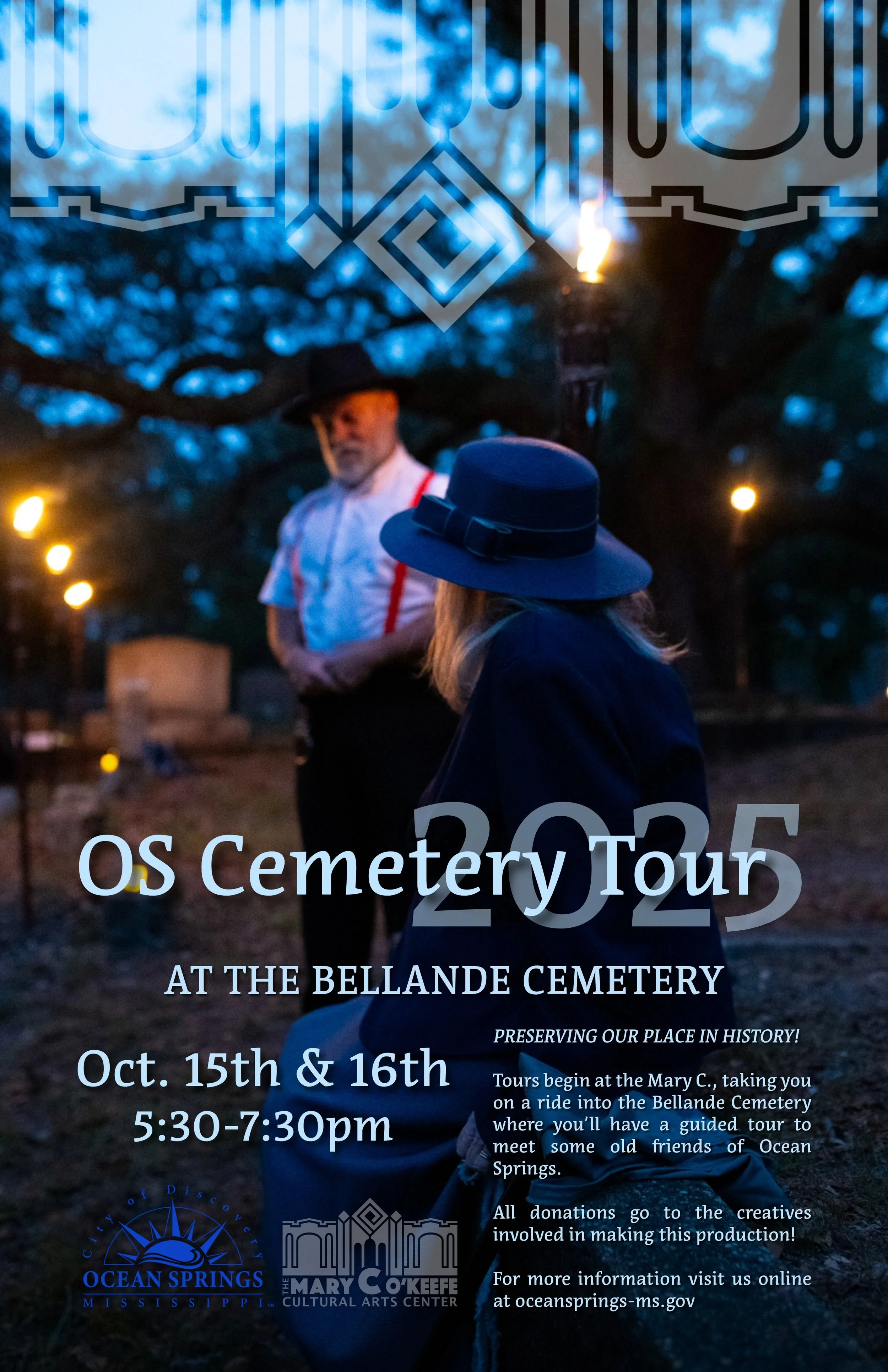 Back to All Events OS Cemetery Tour Wednesday, October 15, 2025 5:30 PM Thursday, October 16, 2025 7:30 PM The Mary C. O'Keefe Cultural Arts Center 1600 Government Street Ocean Springs, MS, 39564 United States (map) Google Calendar ICS