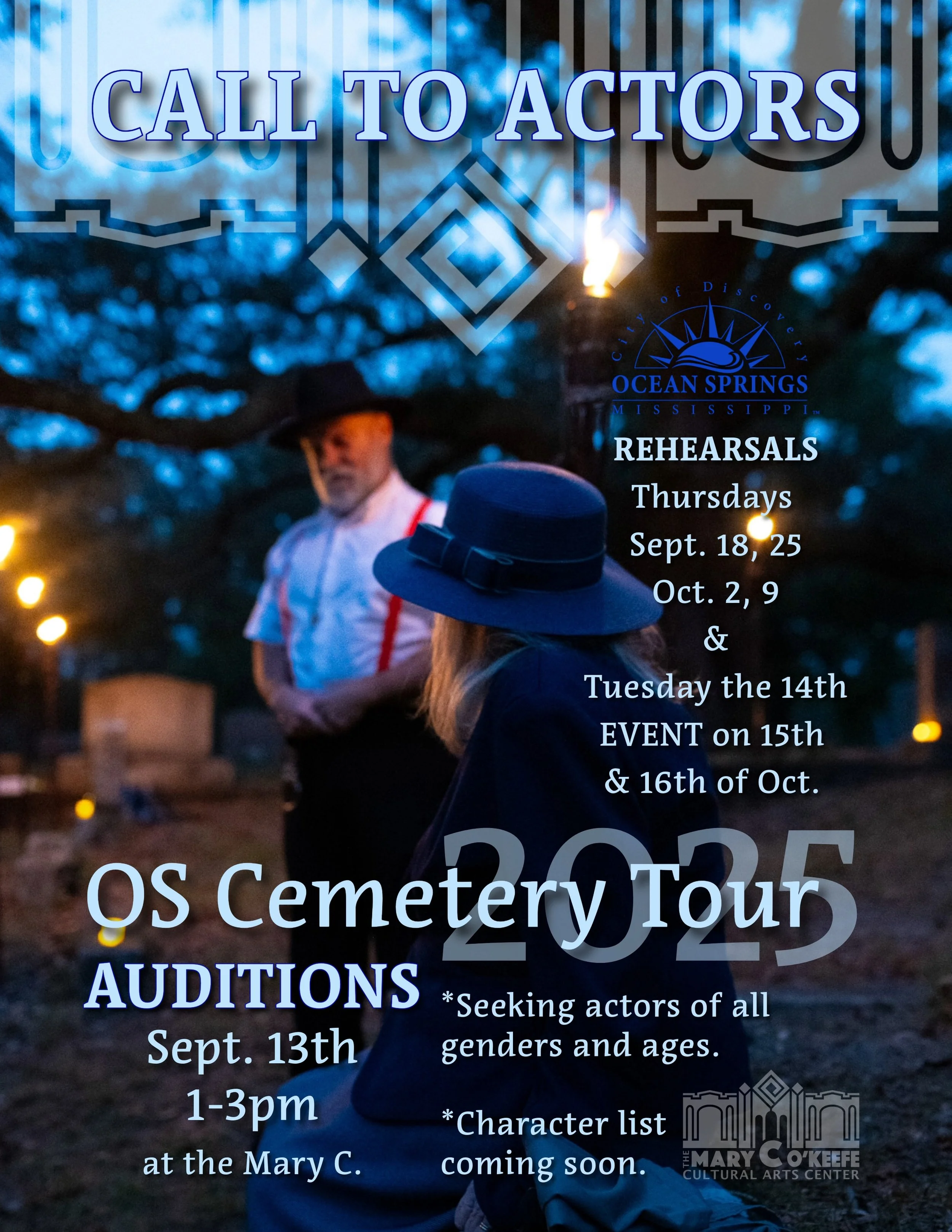 OS Cemetery Tour Auditions Saturday, September 13, 2025 1:00 PM 3:00 PM The Mary C. O'Keefe Cultural Arts Center 1600 Government Street Ocean Springs, MS, 39564 United States (map) Google Calendar ICS